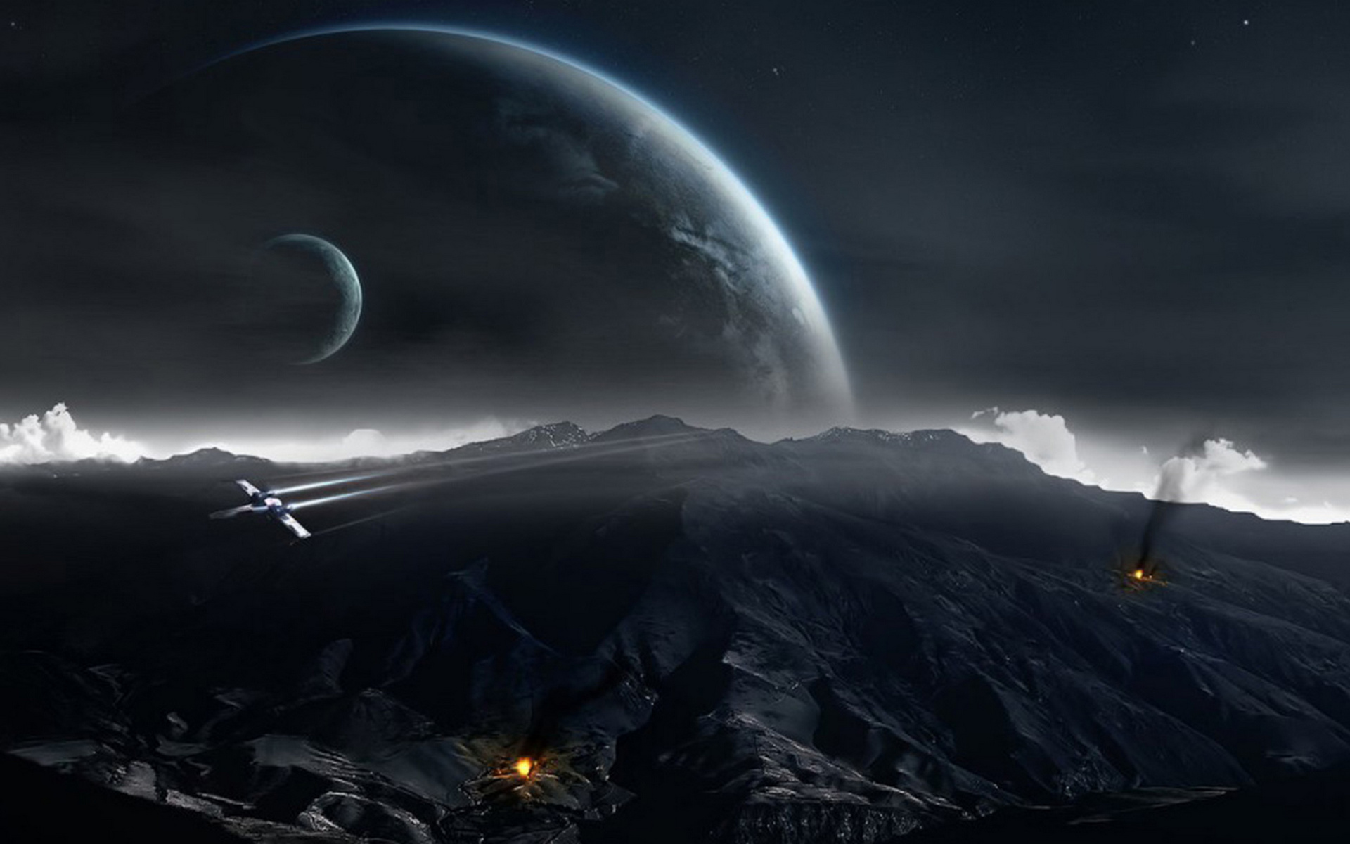 Скачать обои для рабочего стола Космический корабль и костры на планете и фото