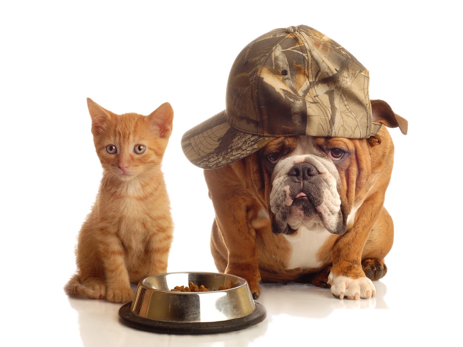 Скачать обои для рабочего стола Котенок и пес в кепке и фото