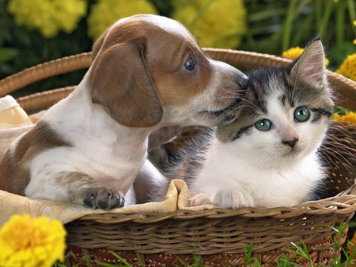 Скачать обои для рабочего стола Котёнок и щенок и фото