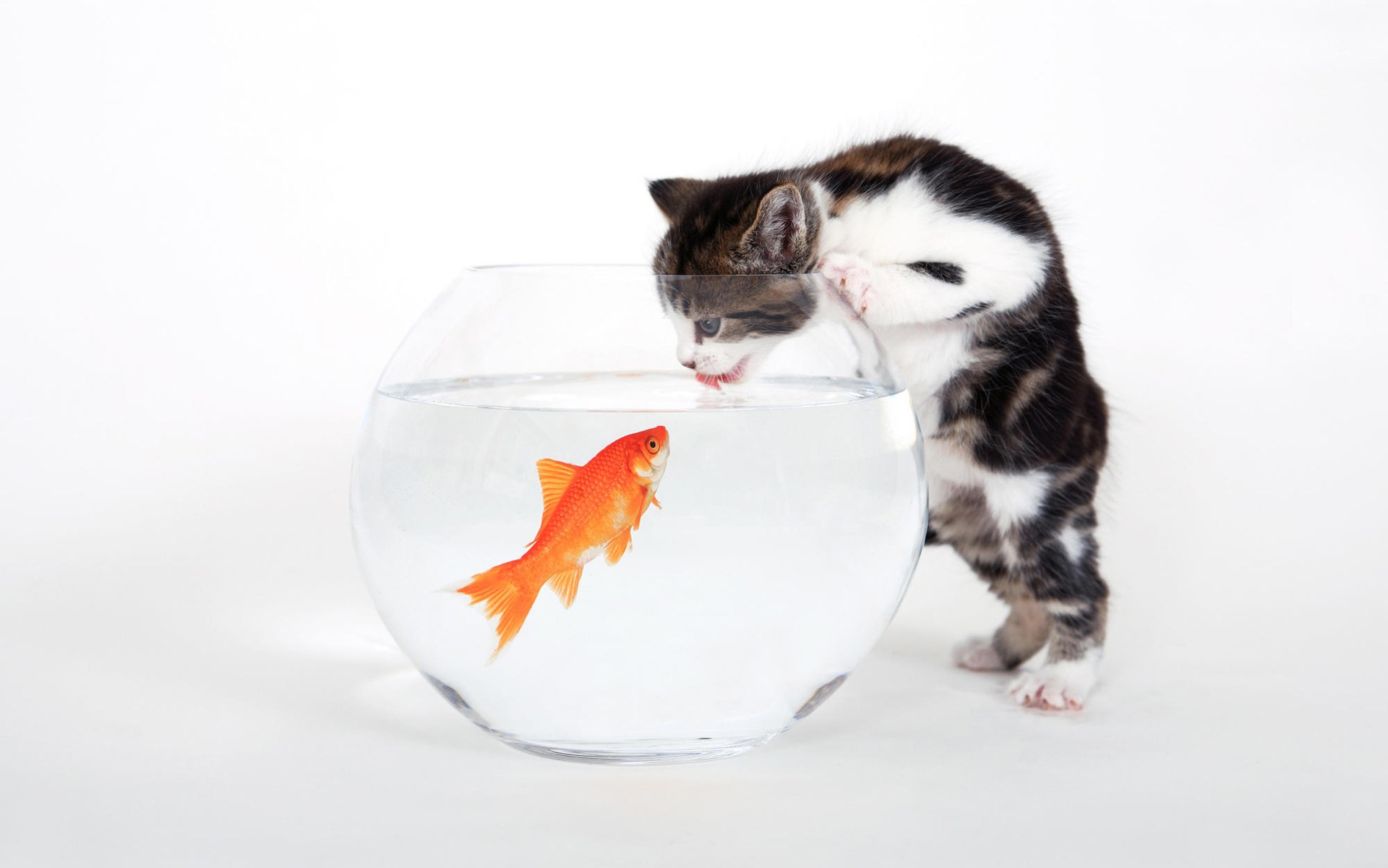 Скачать обои для рабочего стола Котенок пьет с аквариума и фото
