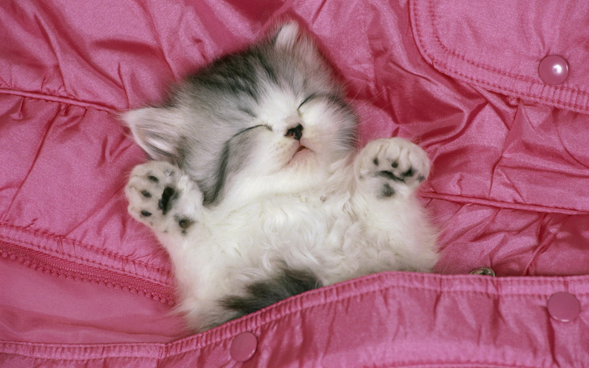 Скачать обои для рабочего стола Котенок сладко спит в розовой постели и фото