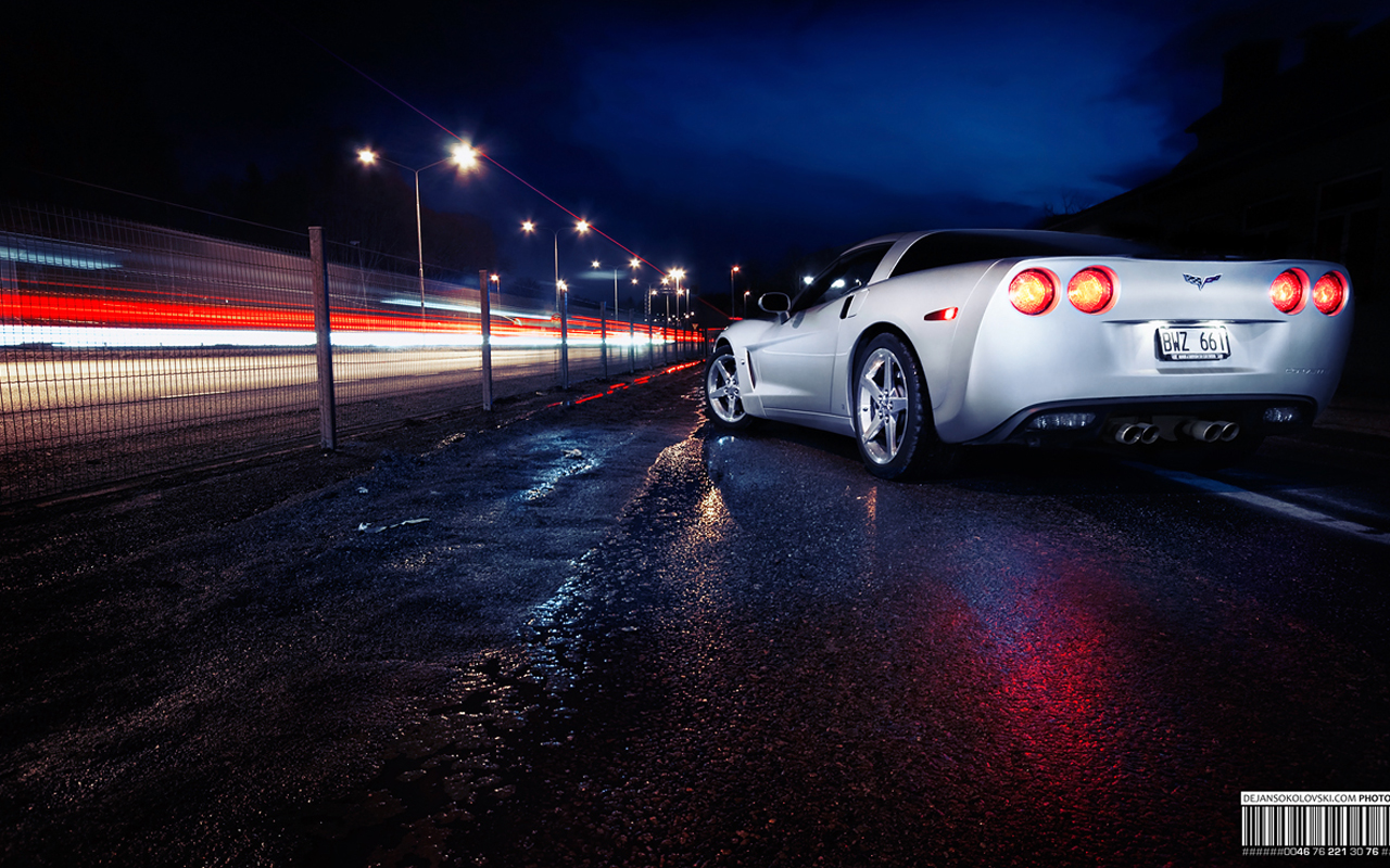 Скачать обои для рабочего стола Красавец Корвет на ночной трассе и фото