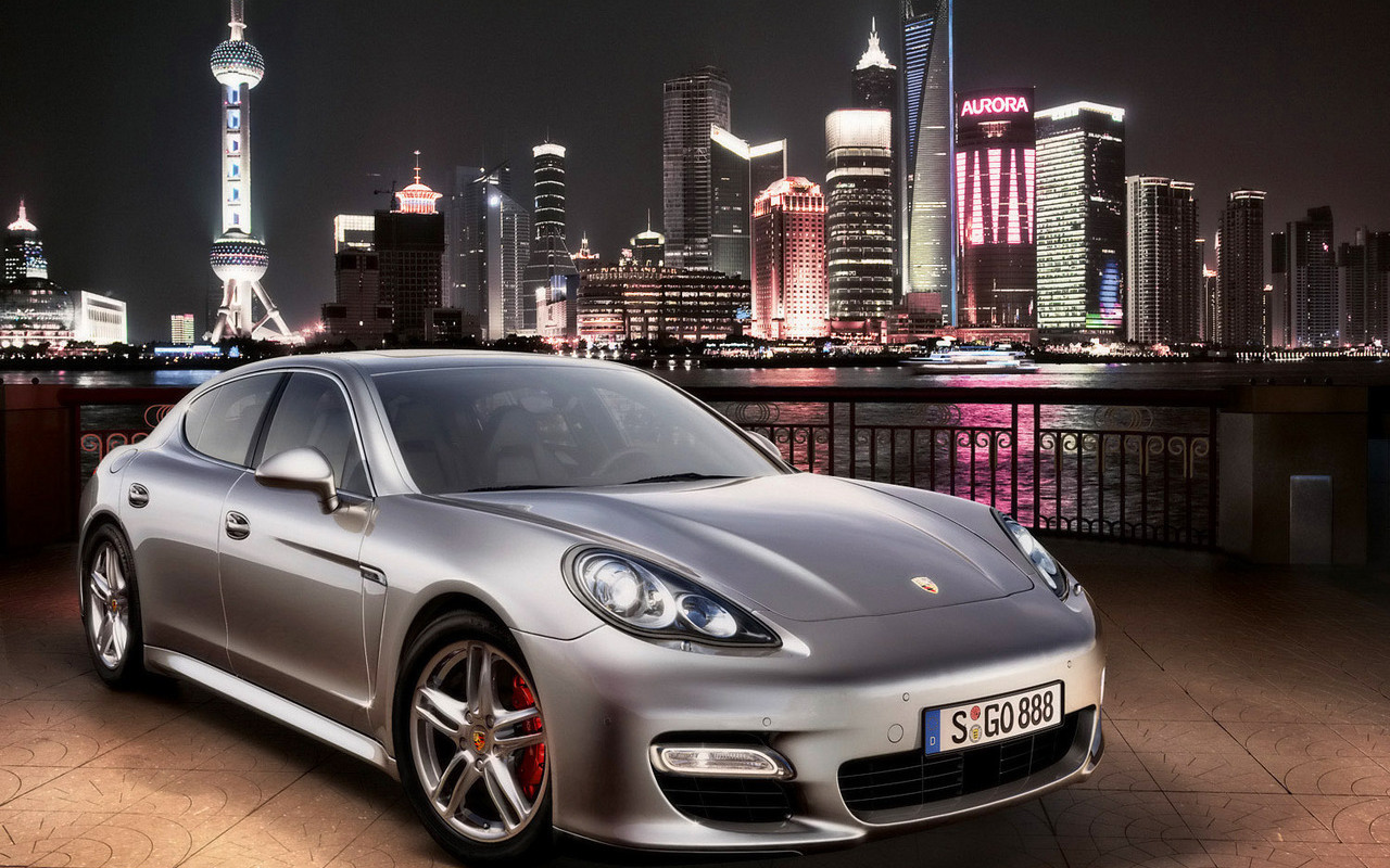Обои Красивая Порш Панамера на фоне ночного города