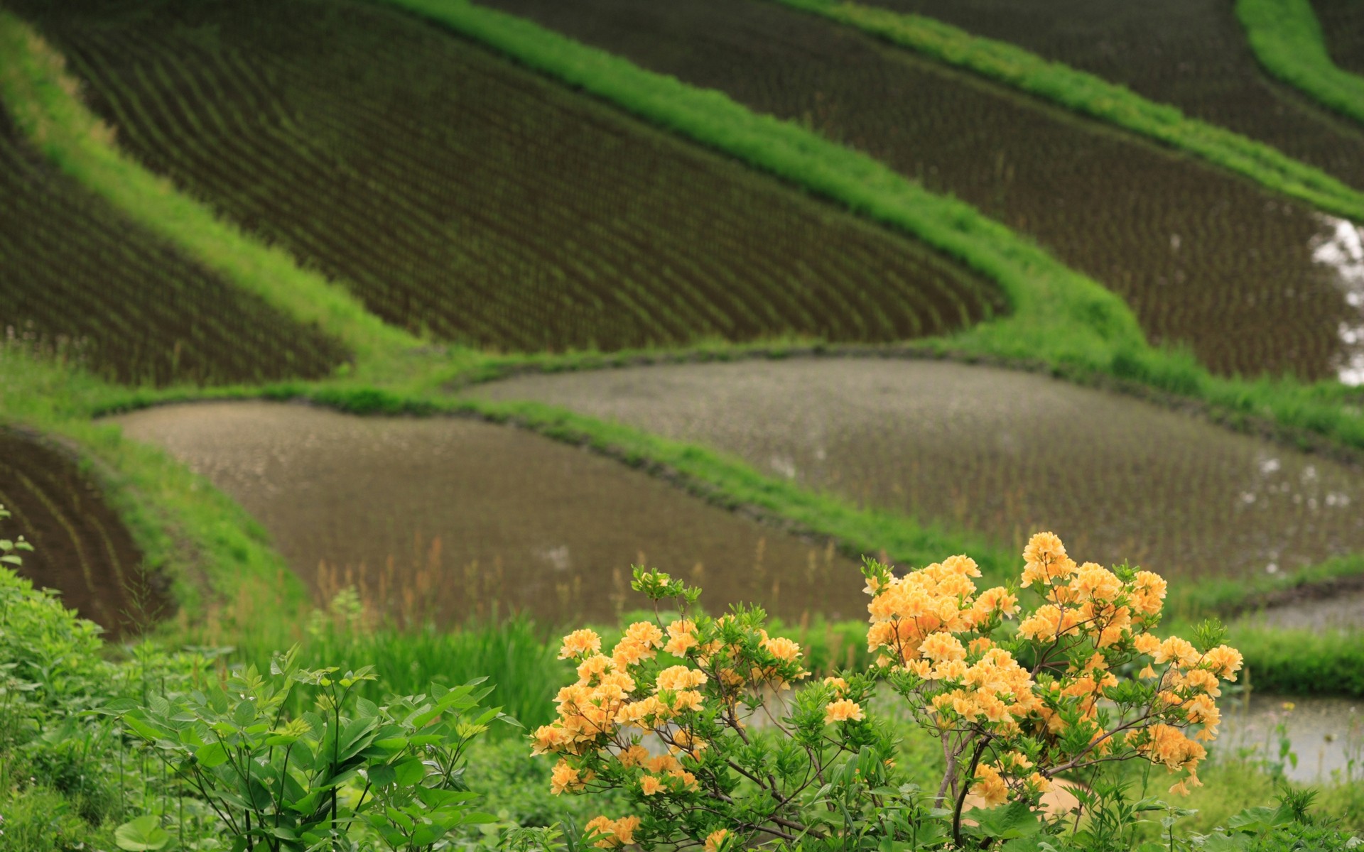Похожие обои на Красивые поля и кустик с желтыми цветками: