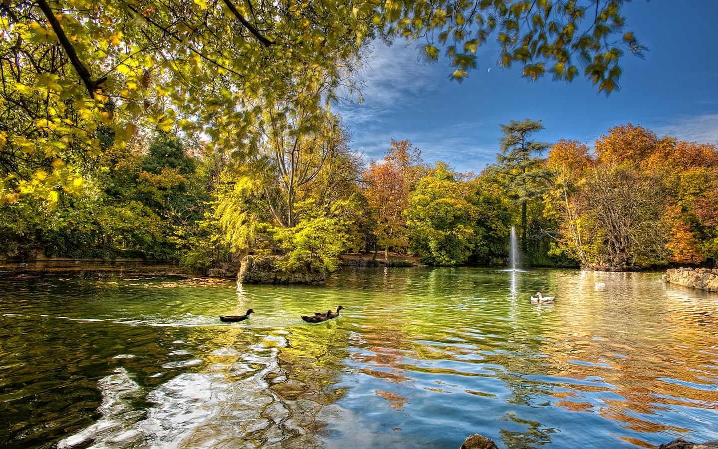 Скачать обои для рабочего стола Красивый осенний сквер, утки в пруду и фото