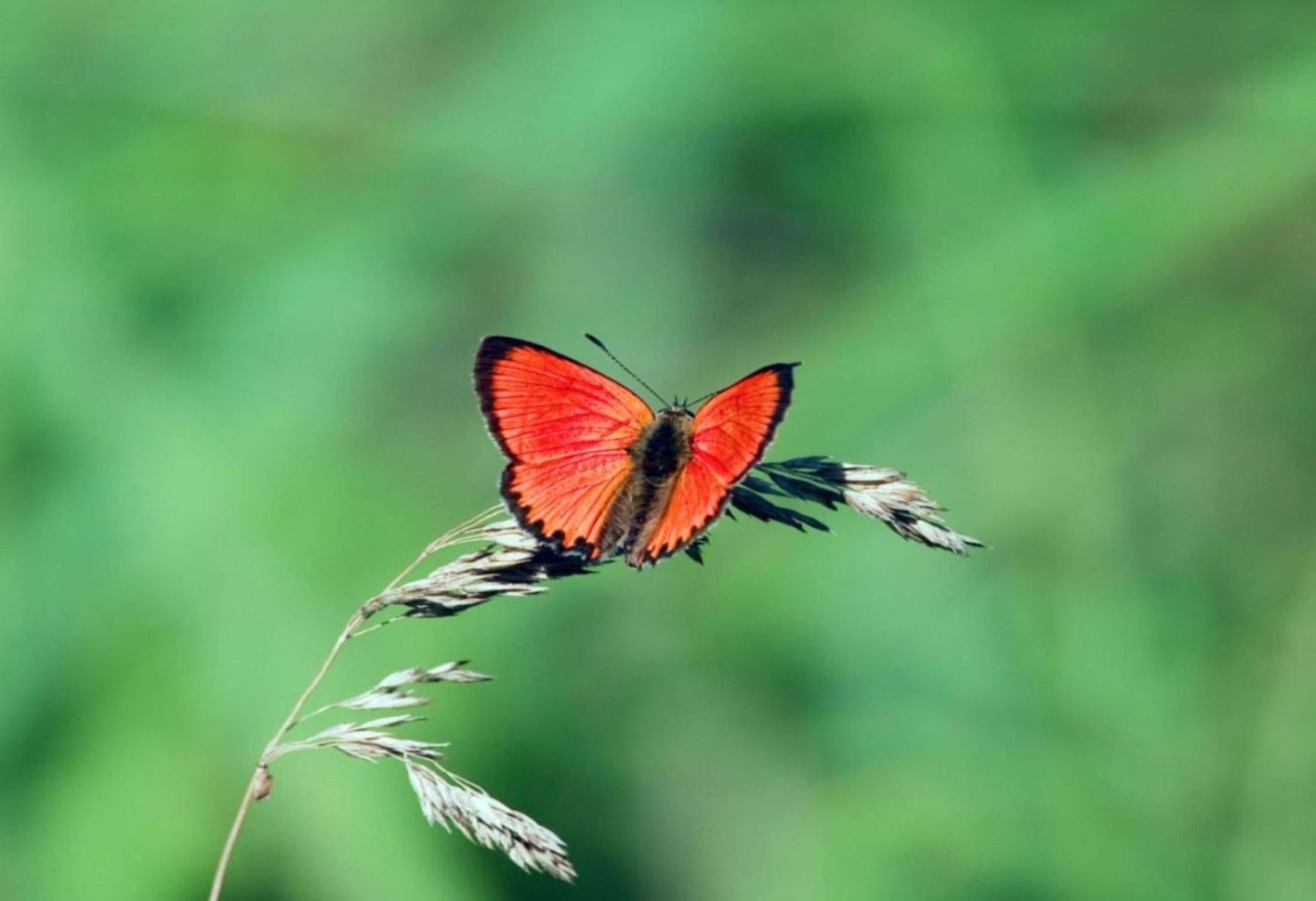 Скачать обои для рабочего стола Красная бабочка на травинке и фото