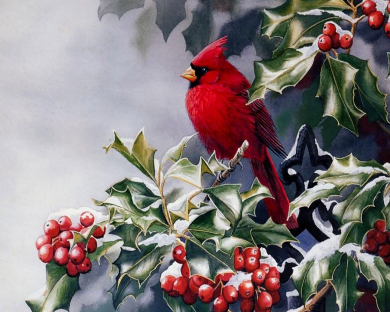Скачать обои для рабочего стола Красная птица на ветке рябины и фото