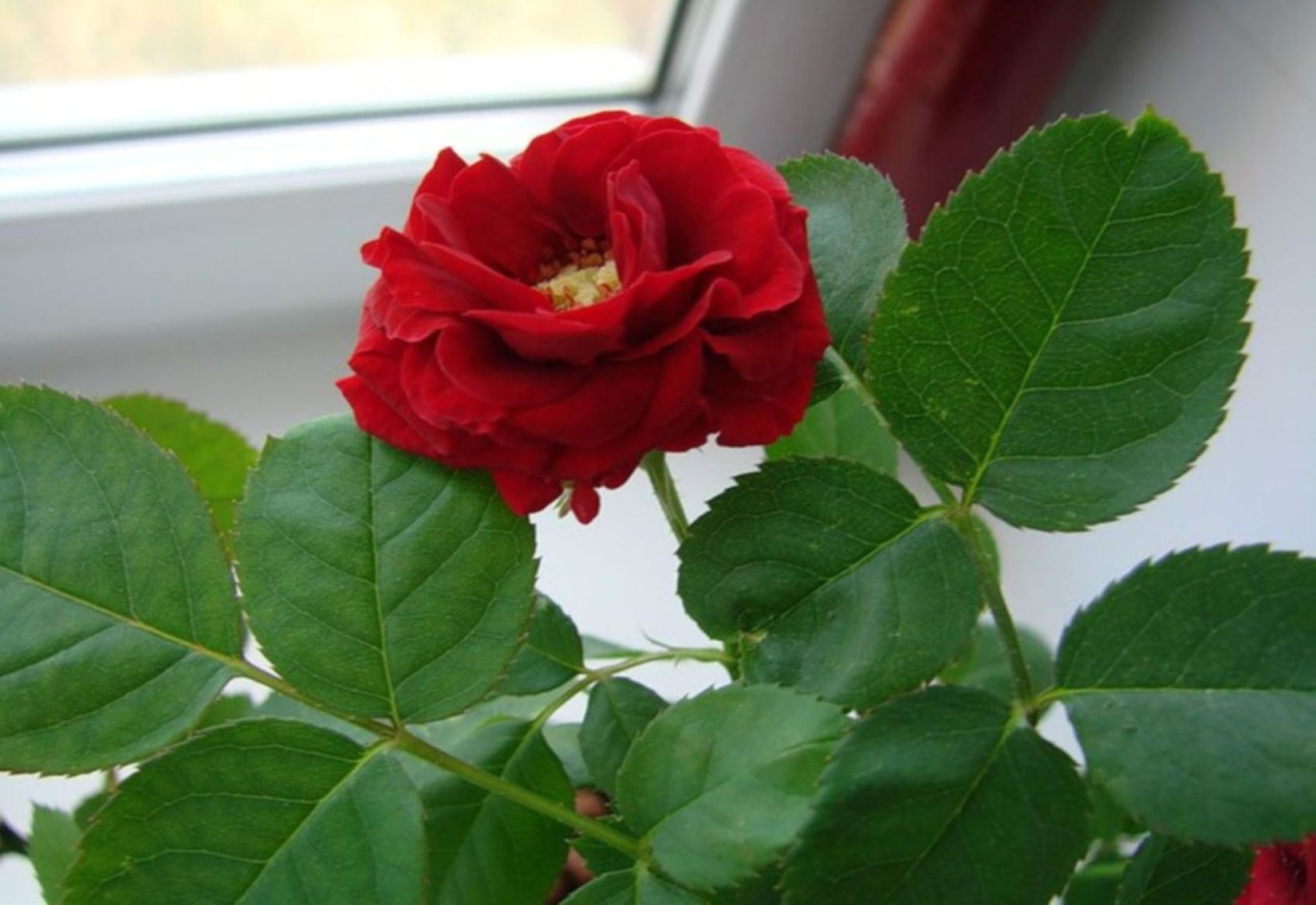 Скачать обои для рабочего стола Красная роза на окне и фото