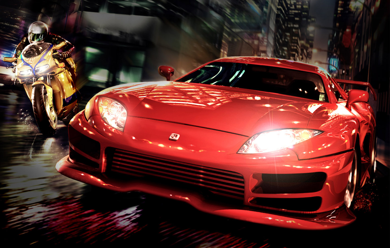 Похожие обои на Красная тачка и мотоциклист: