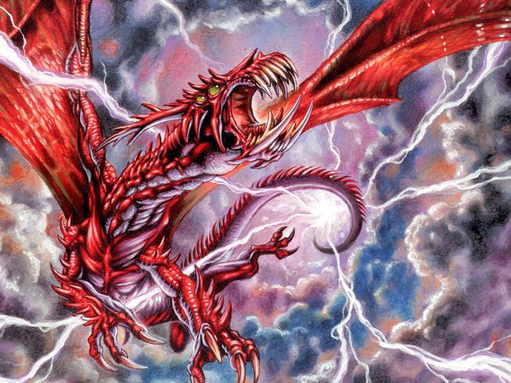 Скачать обои для рабочего стола Красный дракон среди молний и фото