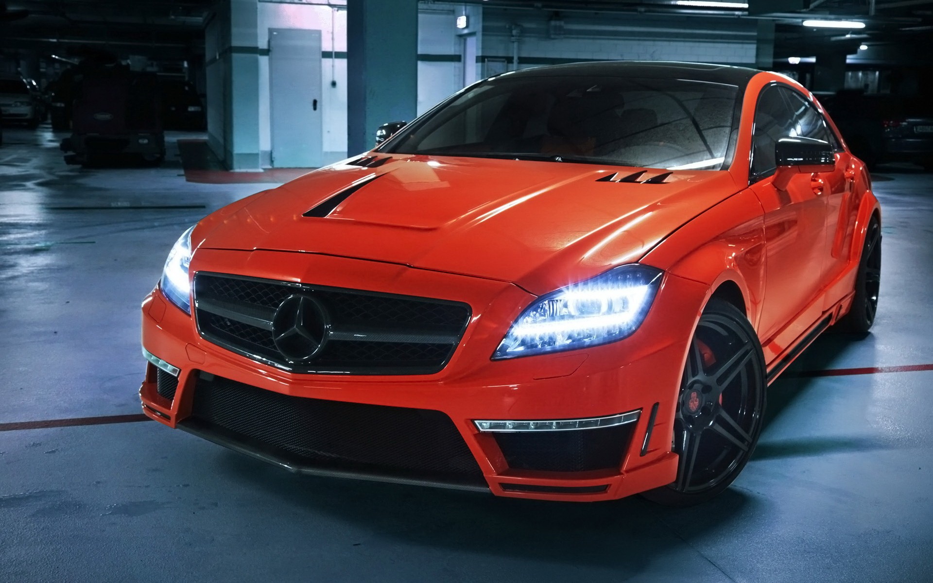Скачать обои для рабочего стола Крaсный мерседес с включеными фарами и фото