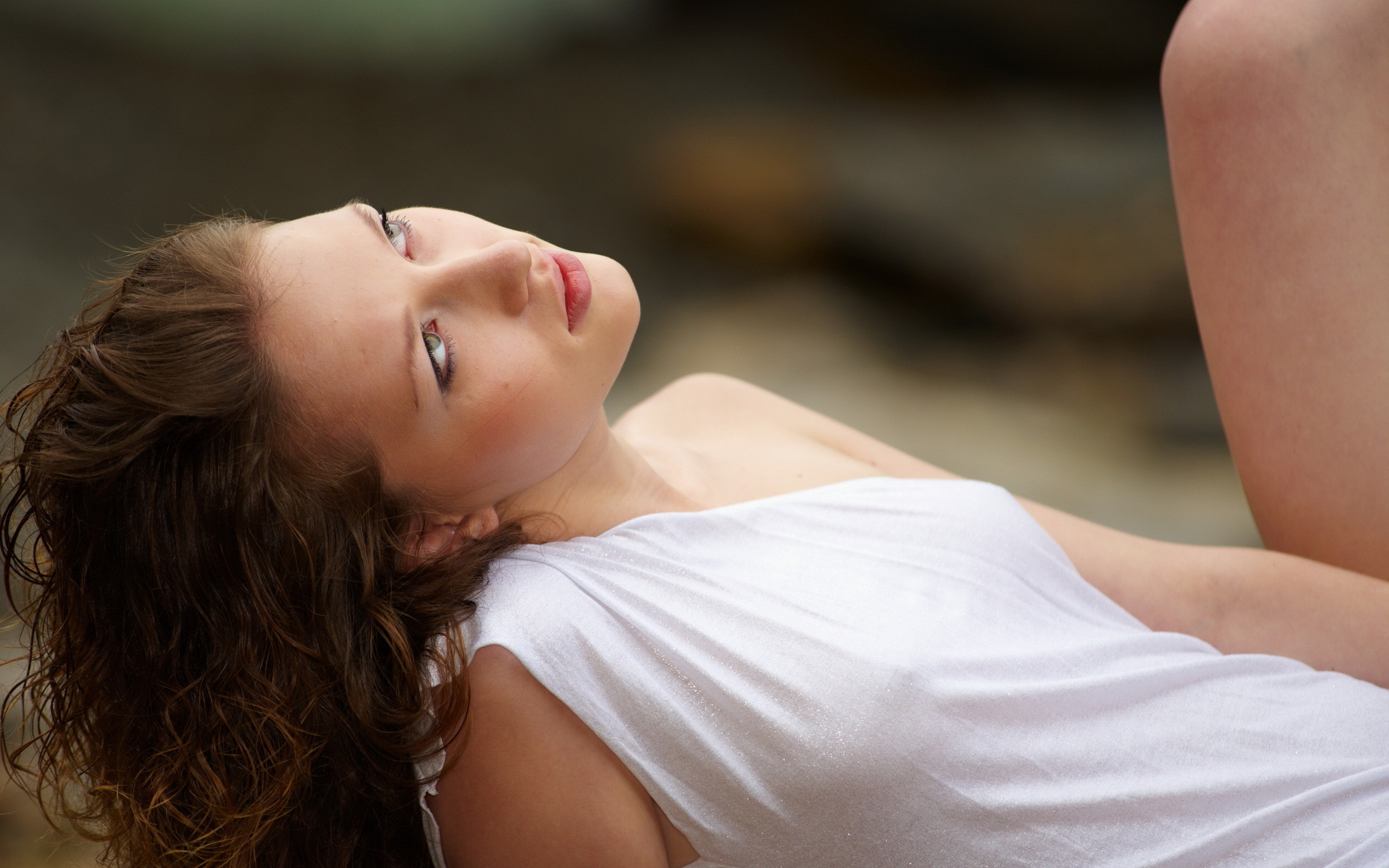 Скачать обои для рабочего стола Красотка в белой тунике со вьющимися волосами и фото
