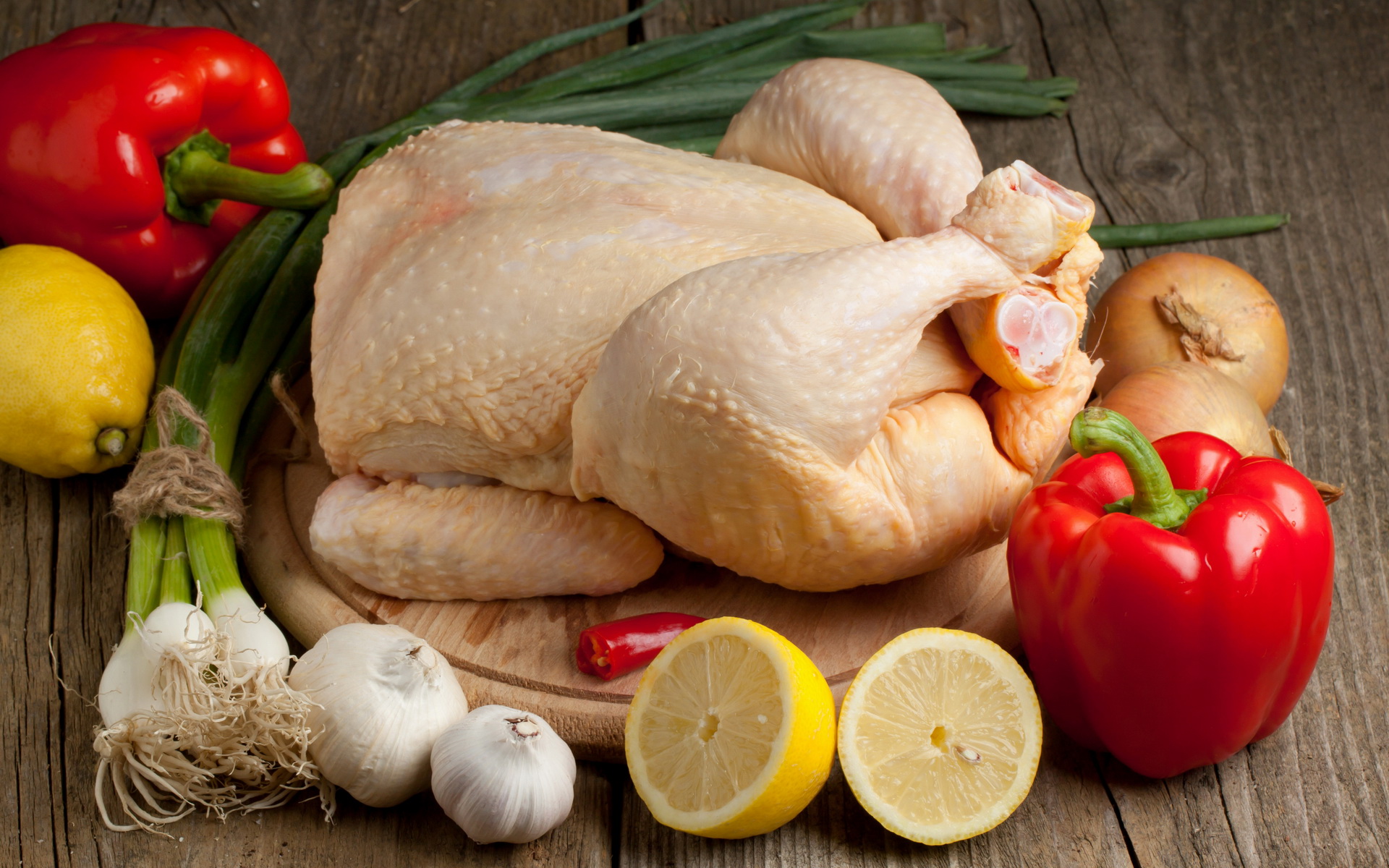 Скачать обои для рабочего стола Курочка с овощами и фото