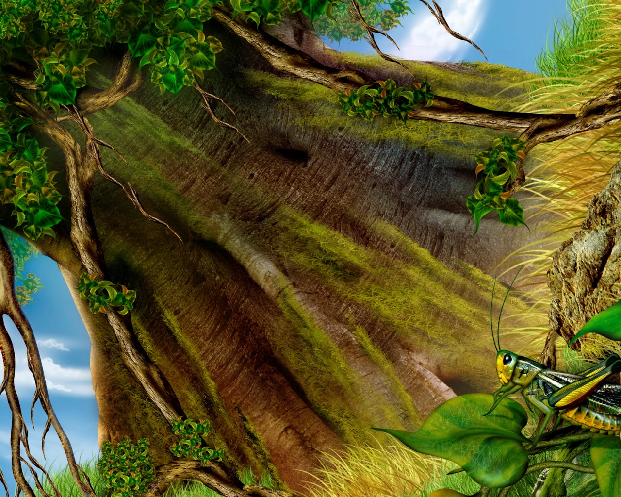 Скачать обои для рабочего стола Кузнечик под деревом и фото
