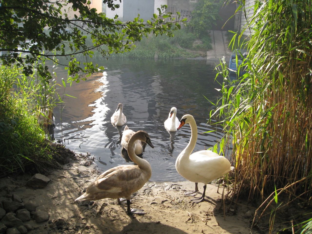 Скачать обои для рабочего стола Лебеди у пруда и фото