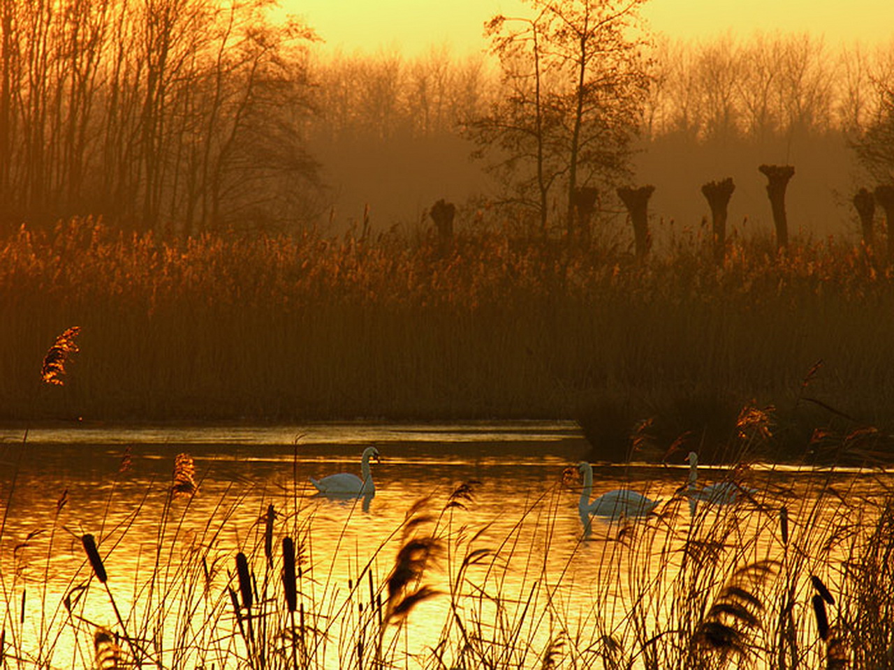 Скачать обои для рабочего стола Лебеди в озере на закате и фото