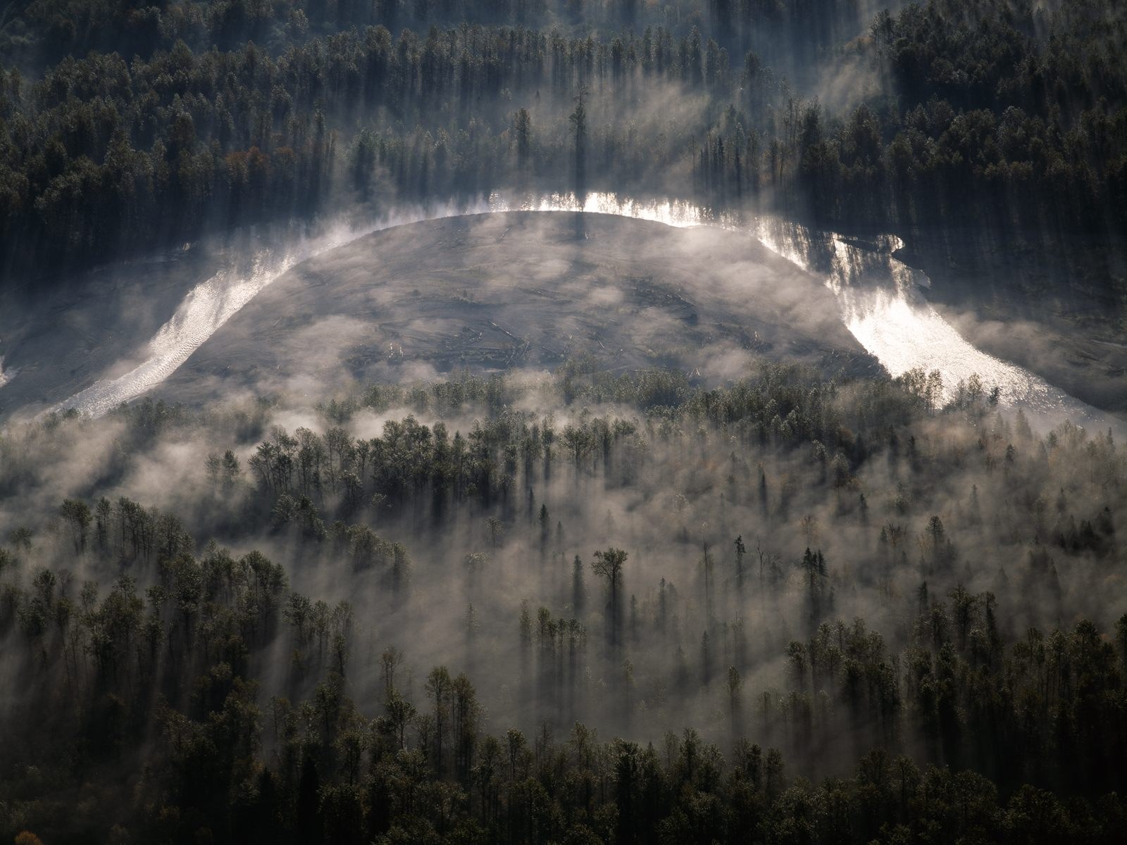 Скачать обои для рабочего стола Лес и река в тумане и фото