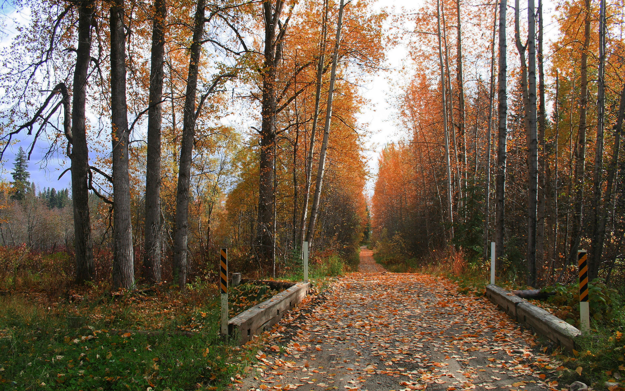 Обои Лесная дорога, усыпанная оранжевыми и жёлтыми листьями