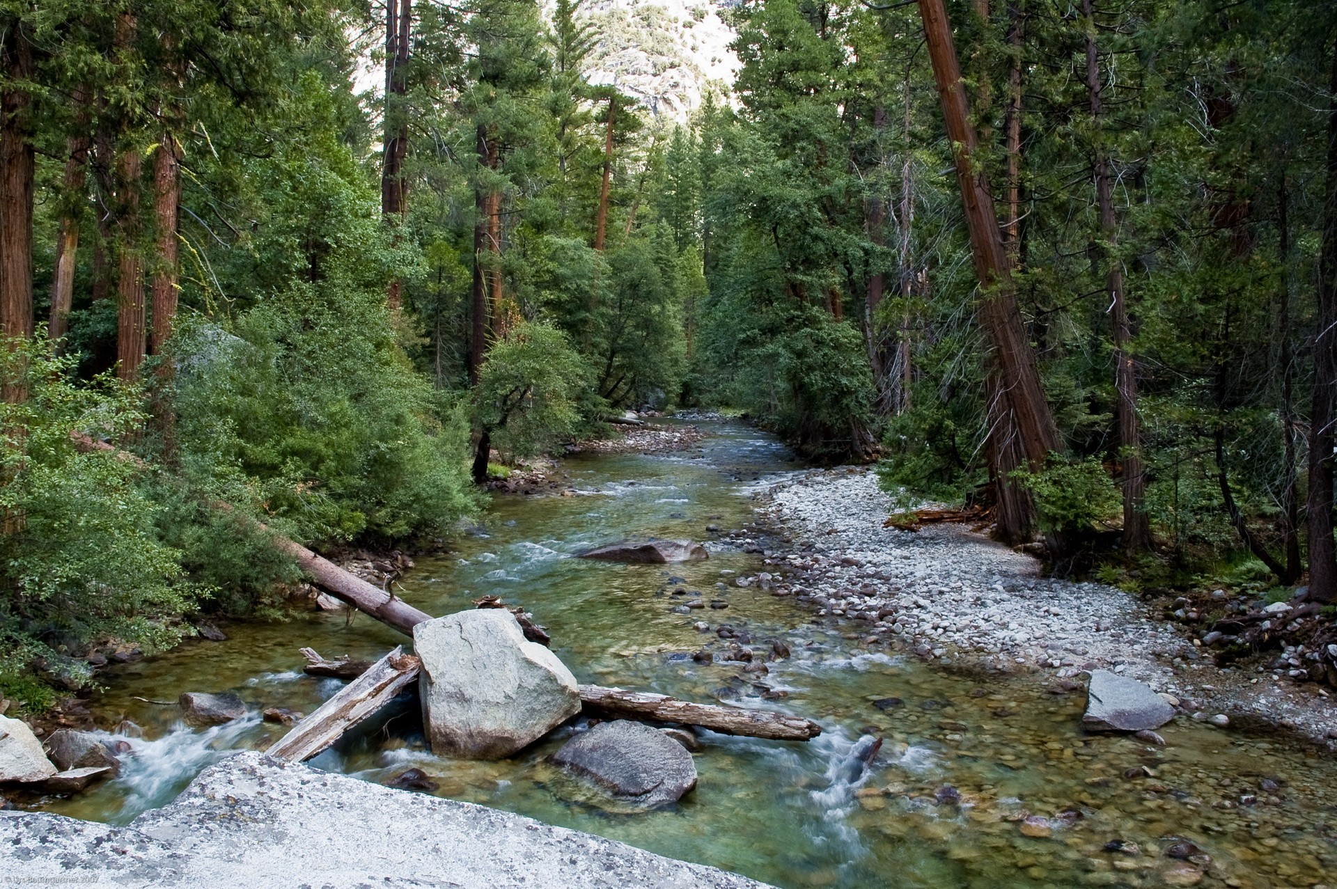 Скачать обои для рабочего стола Лесной ручей в летнем сосновом лесу и фото