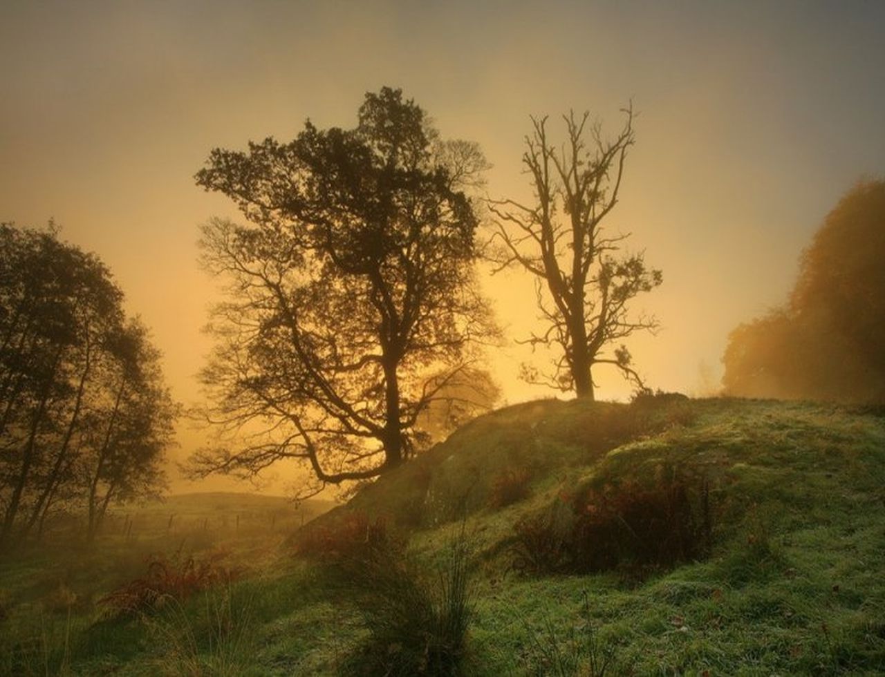 Похожие обои на Летние деревья в тумане, на пригорке: