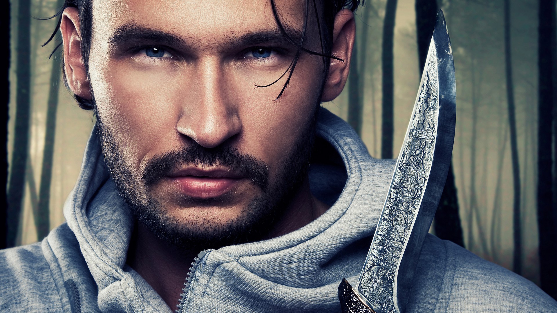 Похожие обои на Лицо мужчины и нож с гравировкой: