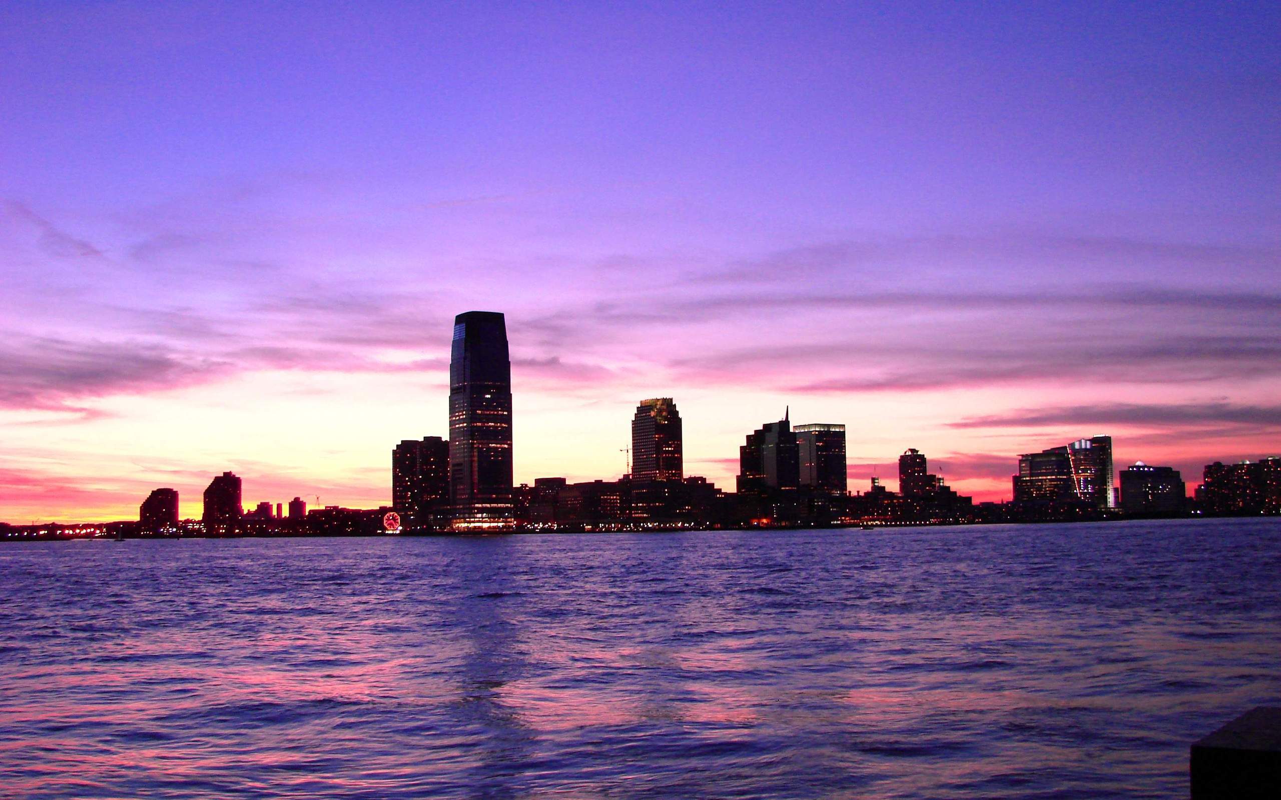 Скачать обои для рабочего стола Лиловый вечер у моря возле города и фото