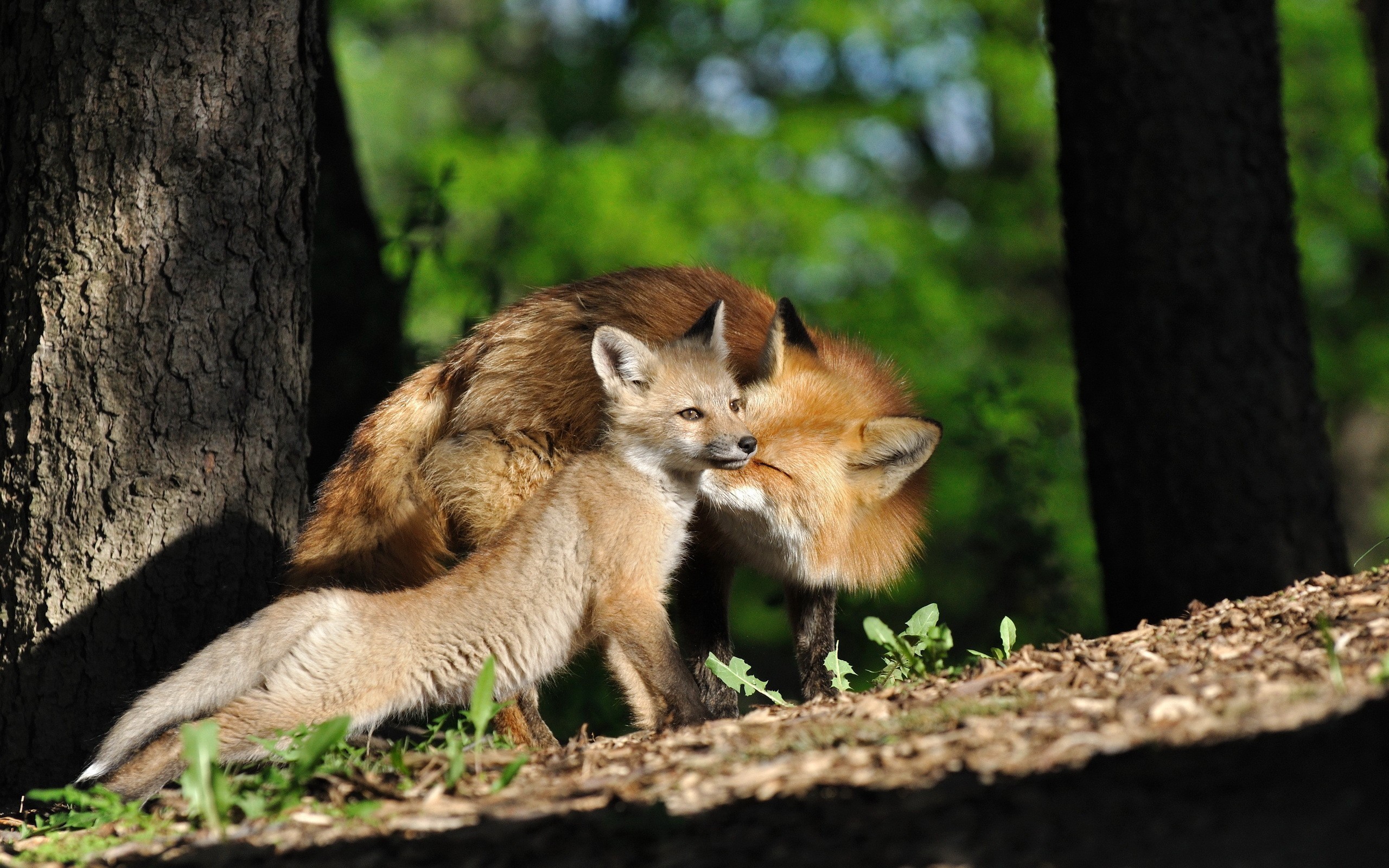 Скачать обои для рабочего стола Лиса с лисенком в лесу и фото