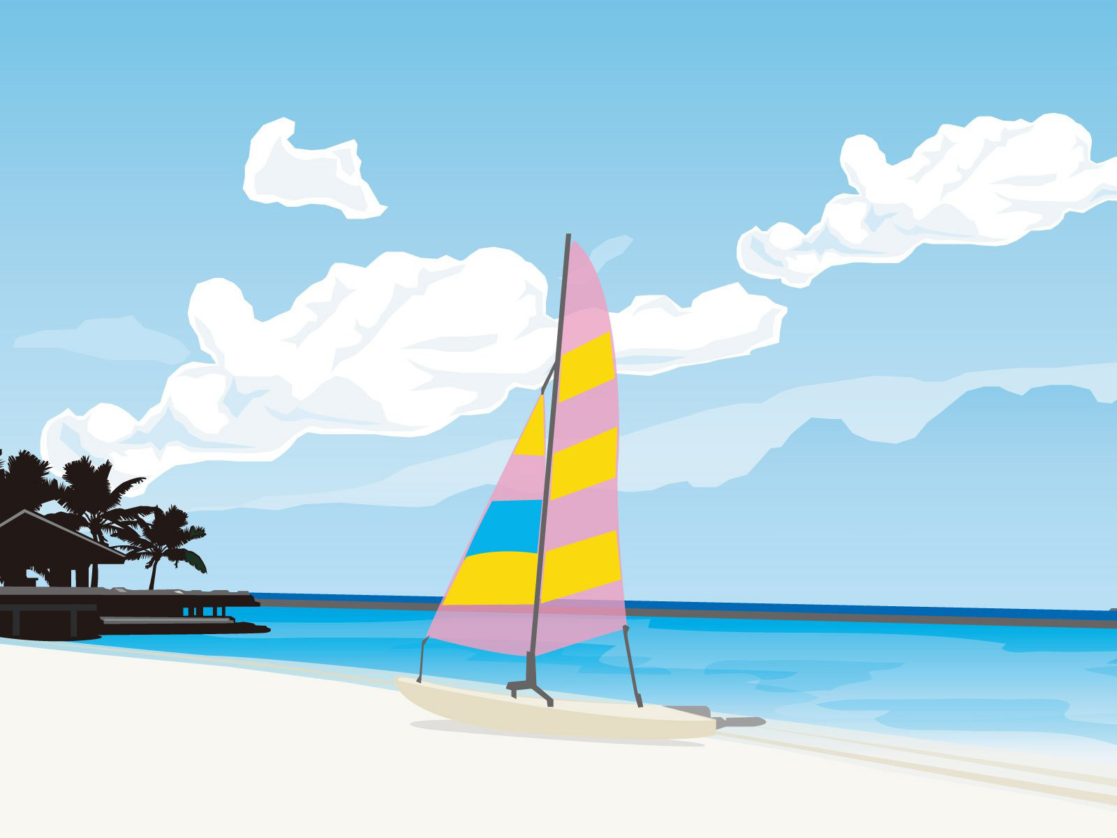 Обои Лодка с цветными парусами, на тропическом берегу пляжа