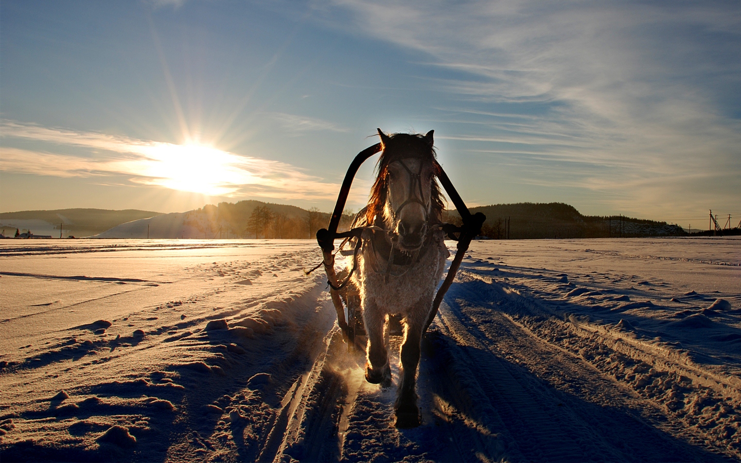 Скачать обои для рабочего стола Лошадь запряженная в сани и фото