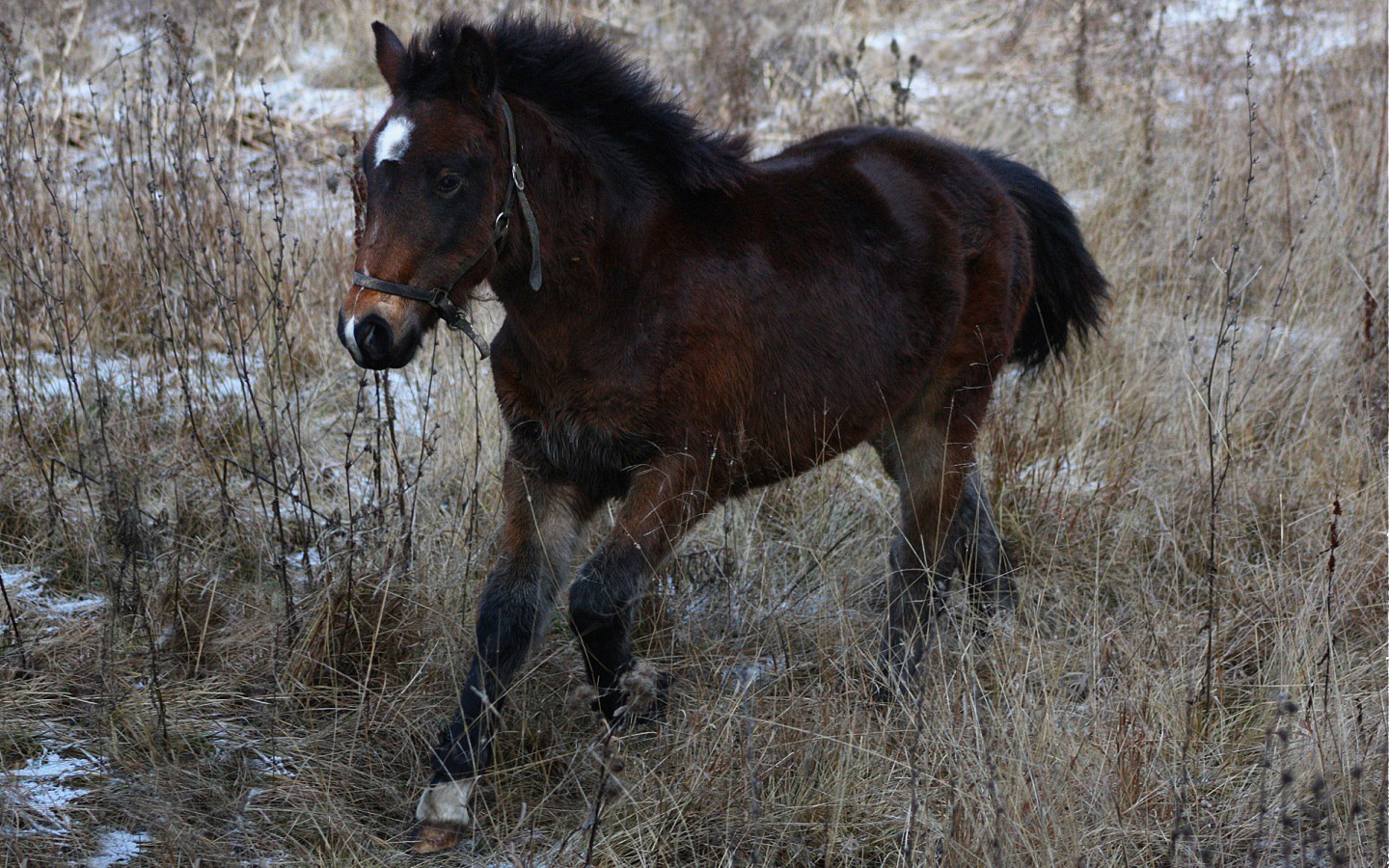 Скачать обои для рабочего стола Лошадка идущая по сухой траве и фото