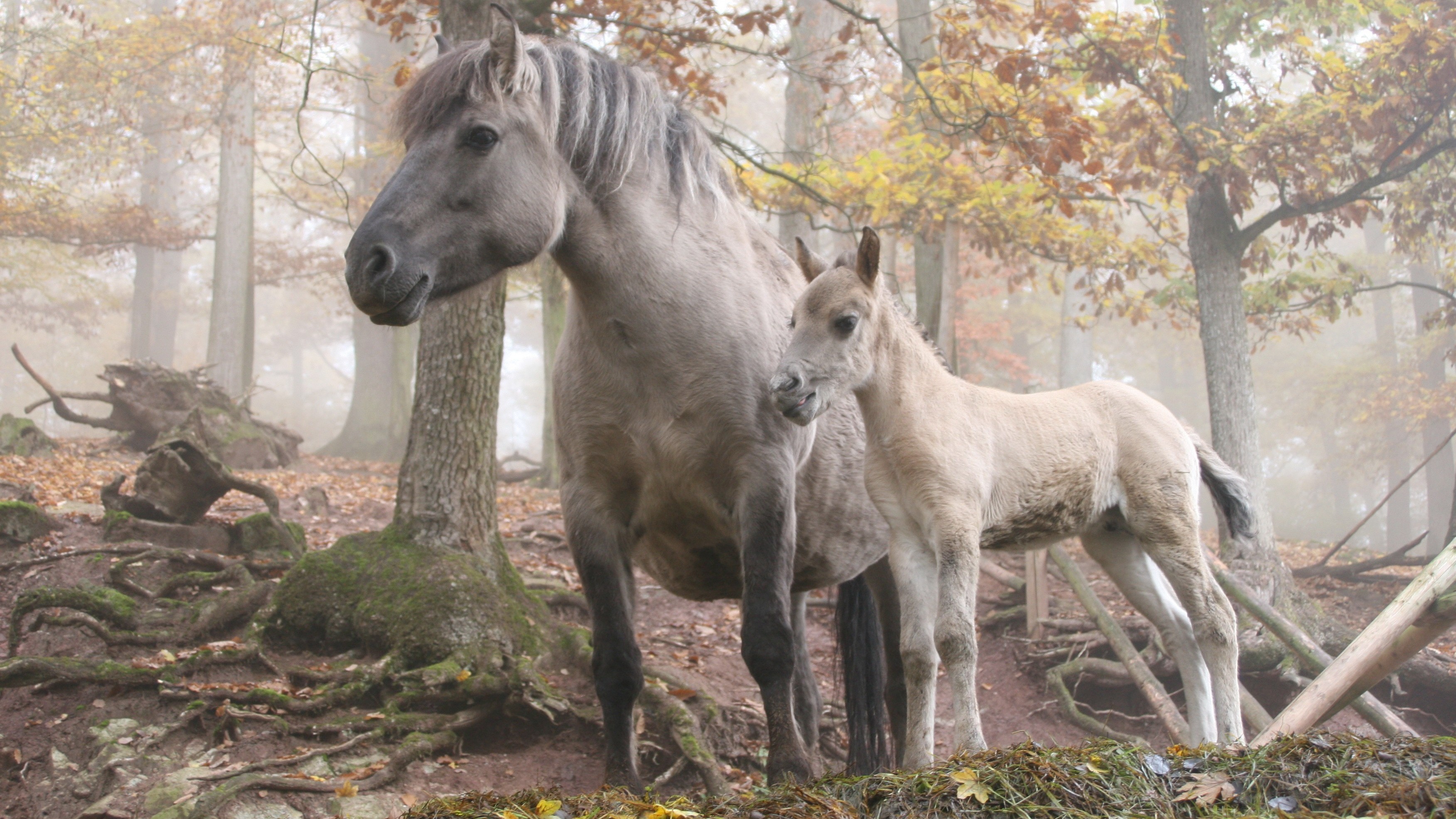 Скачать обои для рабочего стола Лошадки в осеннем лесу и фото
