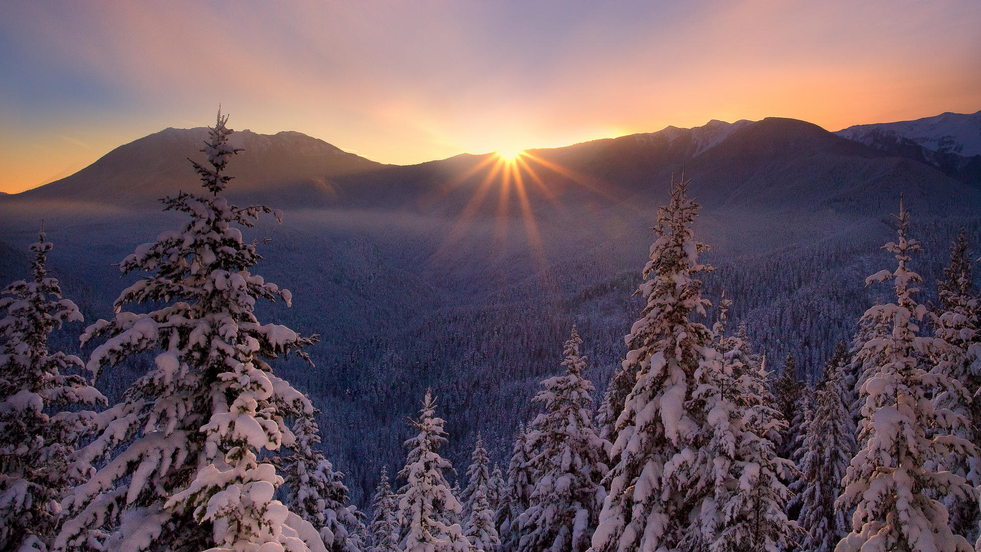 Скачать обои для рабочего стола Лучи солнца садящегося за гору и фото