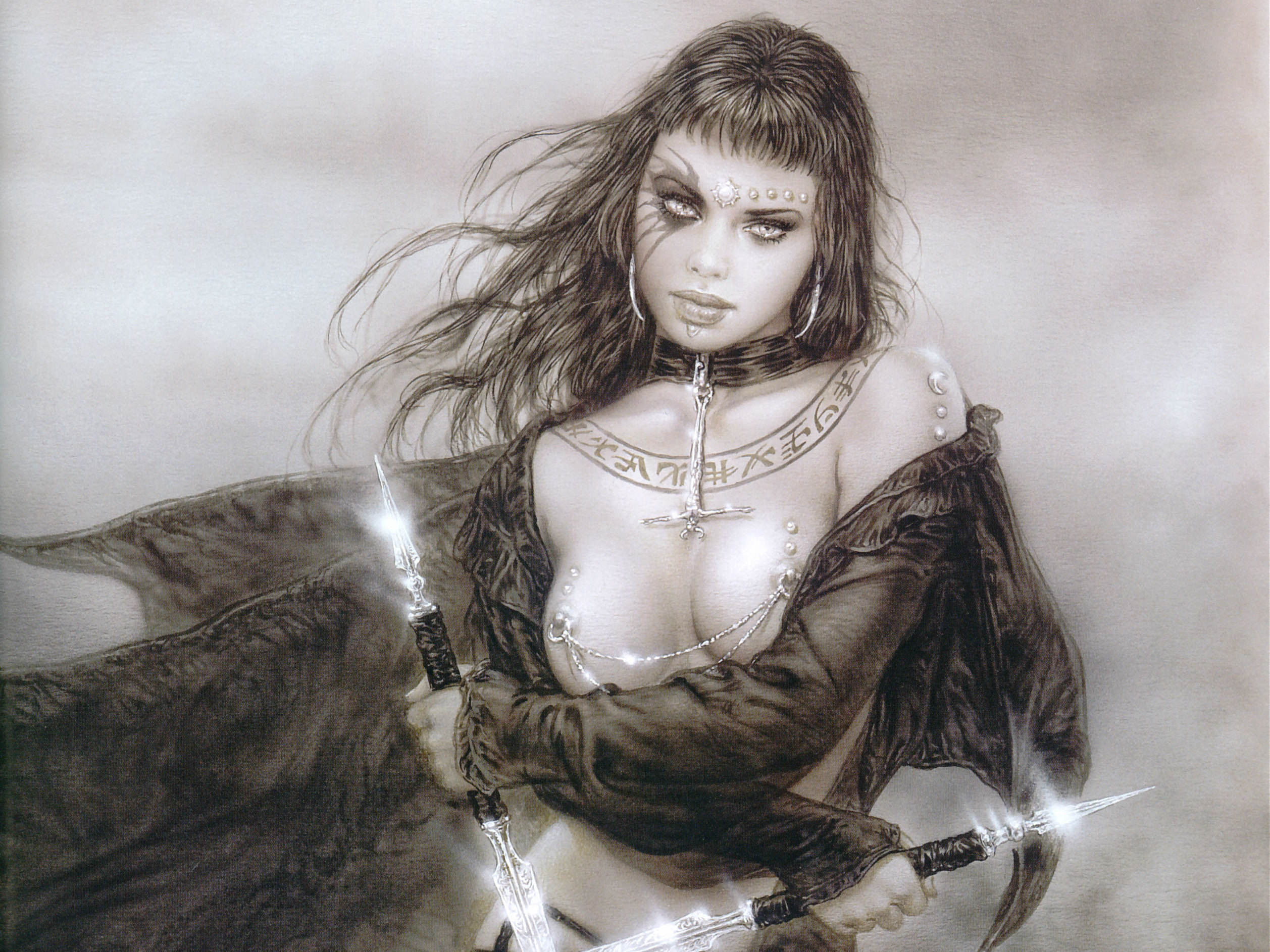 Скачать обои для рабочего стола Luis Royo, девушка с блестящими кинжалами и фото
