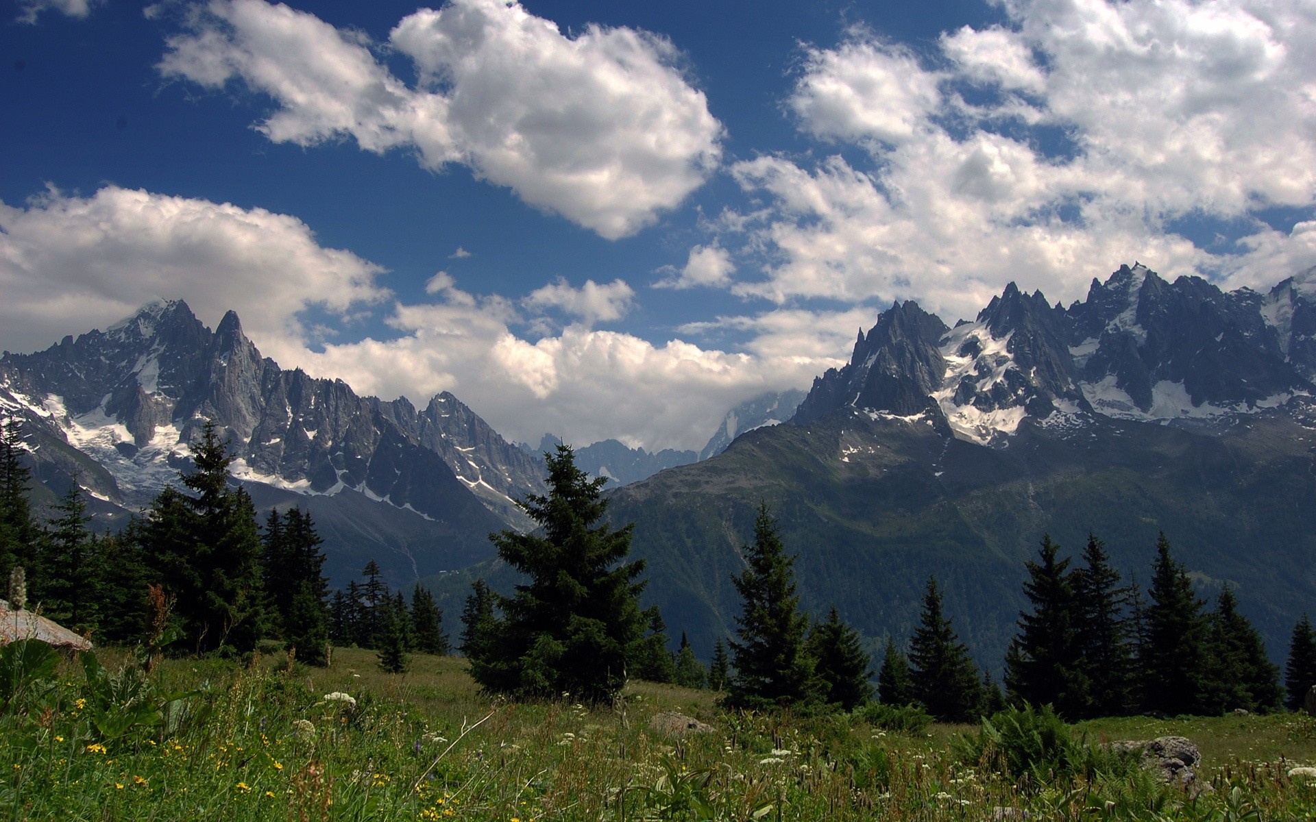 Скачать обои для рабочего стола Лужайка, хвойные деревья и горы и фото