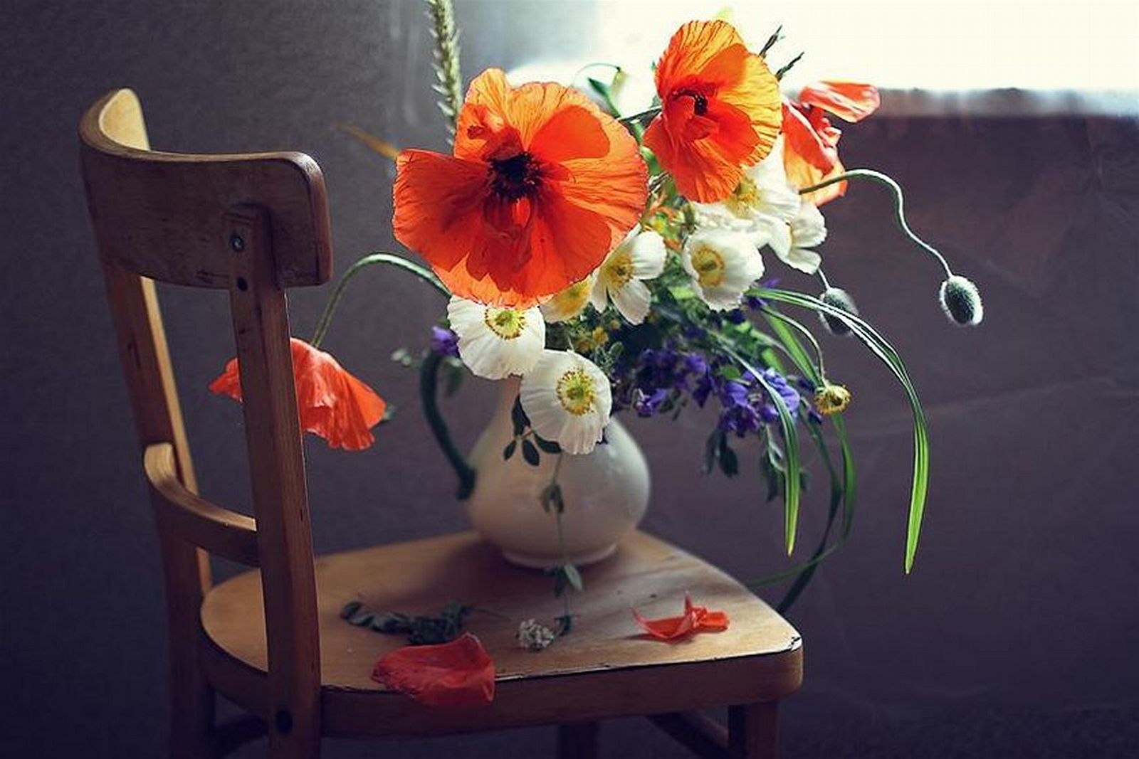 Скачать обои для рабочего стола Маки в кувшине на стуле и фото