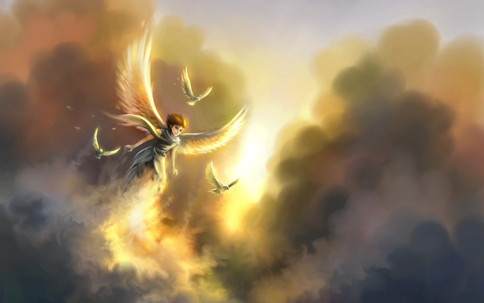 Скачать обои для рабочего стола Мальчик ангел и птицы в облачном небе и фото
