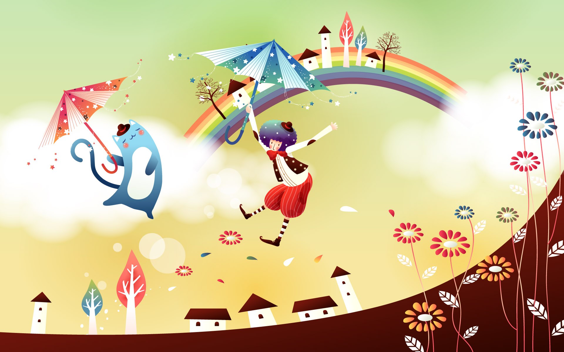 Обои Мальчик и кот летают на зонтах