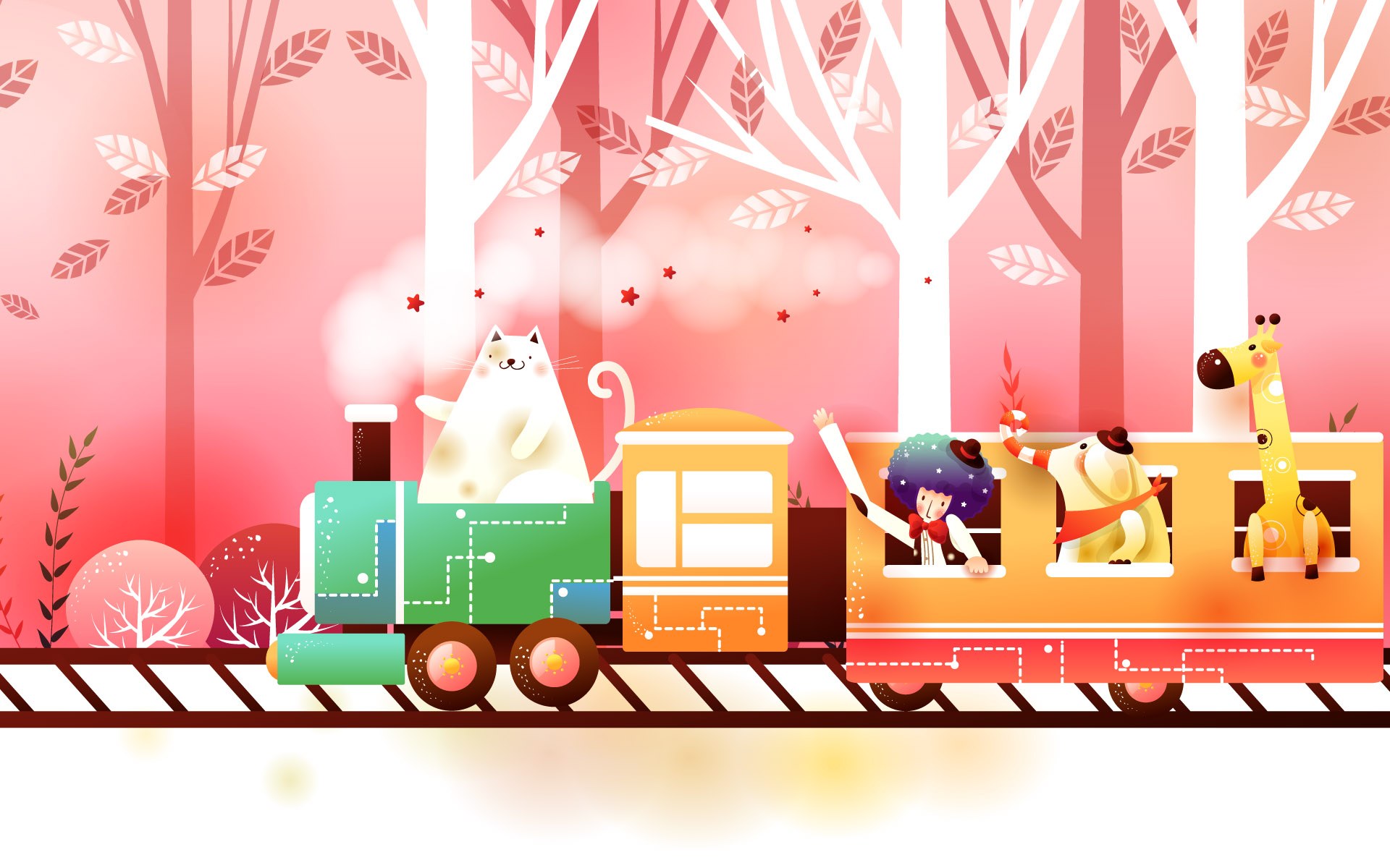 Скачать обои для рабочего стола Мальчик с животными едут в поезде и фото