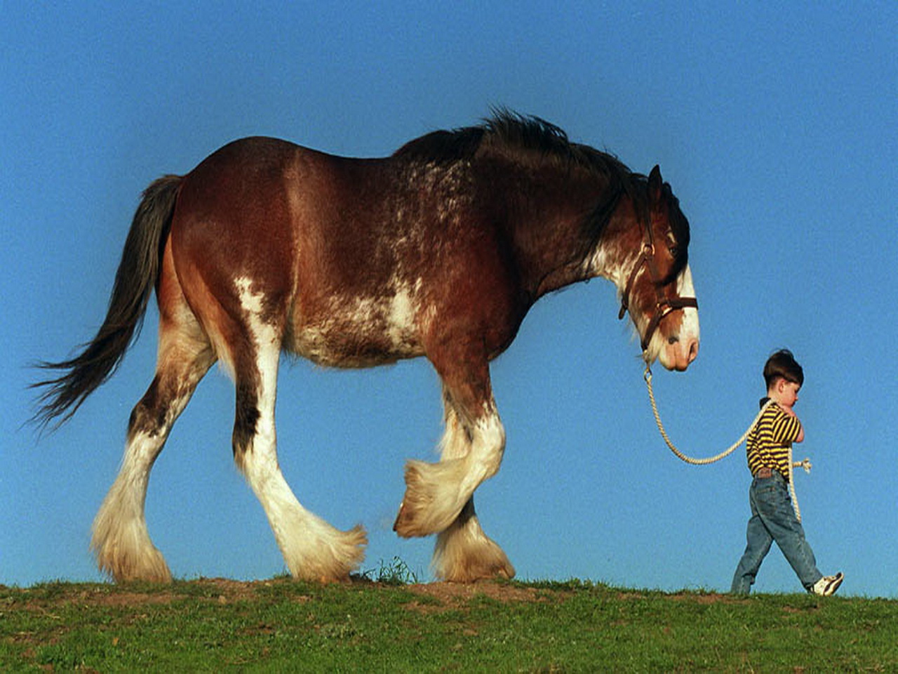 Скачать обои для рабочего стола Мальчик ведет за собой гнедого коня и фото