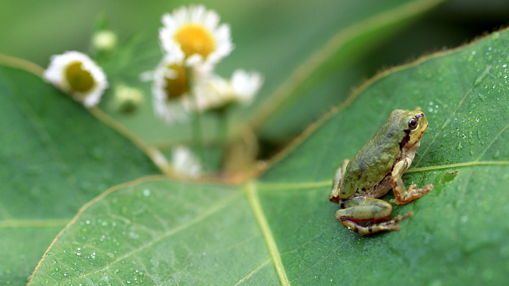 Скачать обои для рабочего стола Маленькая лягушка на листе и фото
