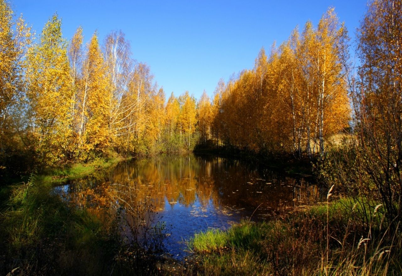 Скачать обои для рабочего стола Маленький пруд и осенние молодые берёзки и фото