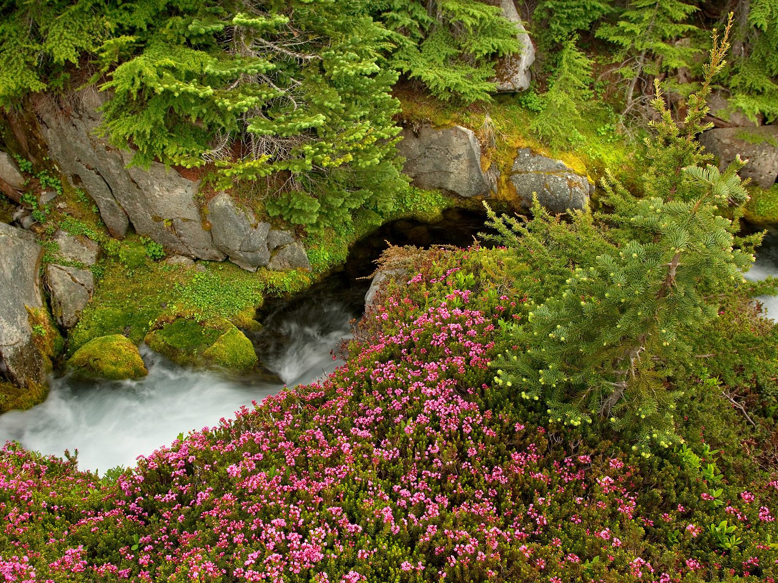 Скачать обои для рабочего стола Маленький весенний ручей среди зелени и фото