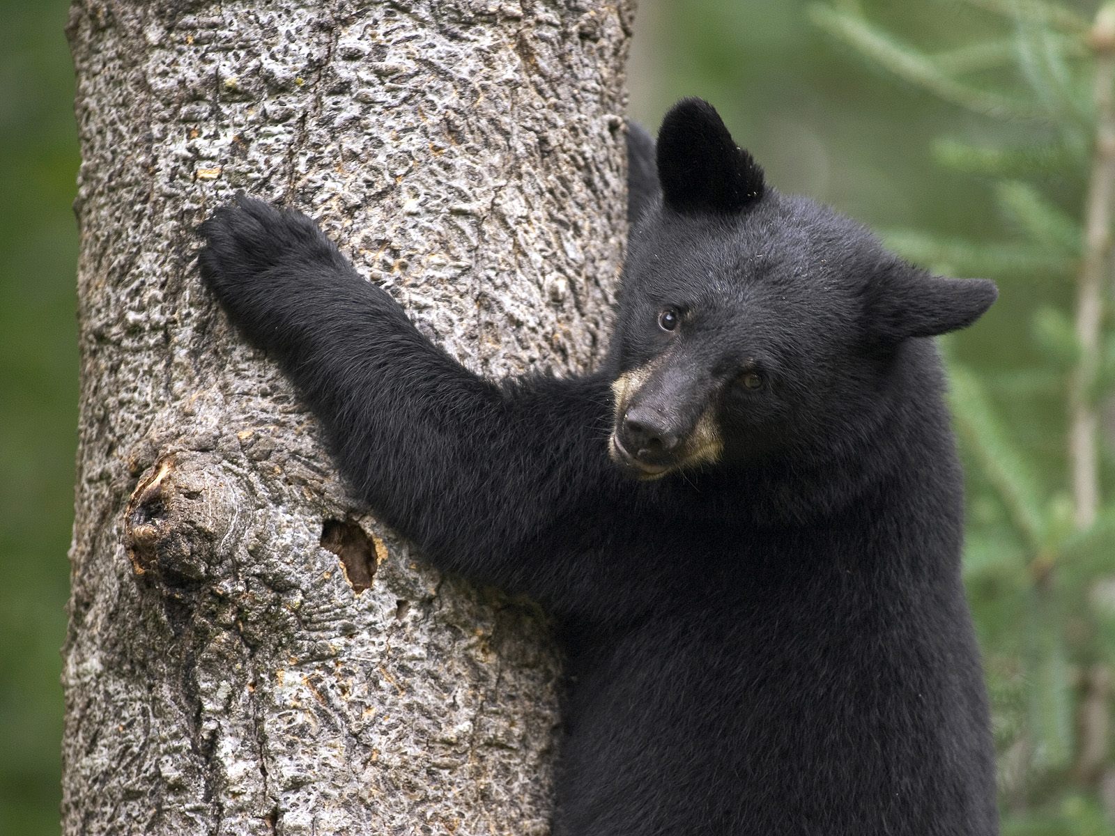 Скачать обои для рабочего стола Медведь обнимает дерево и фото