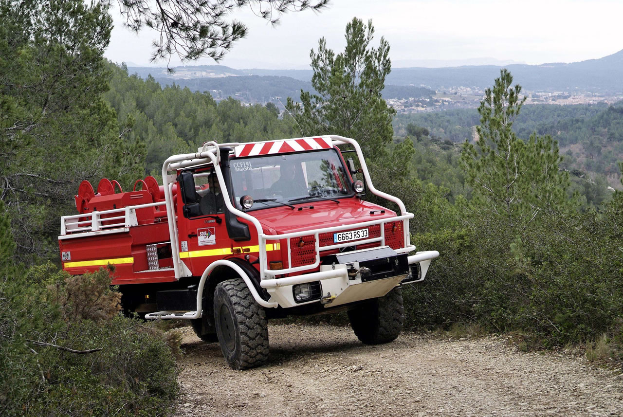 Обои Mercedes-Benz Unimog пожарный в лесу