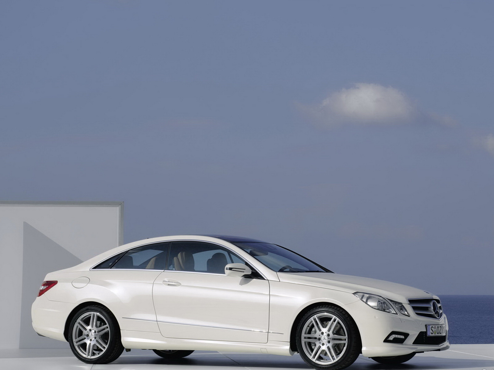 Скачать обои для рабочего стола Mercedes_E coupe вид машины в салоне с другого ракурса и фото