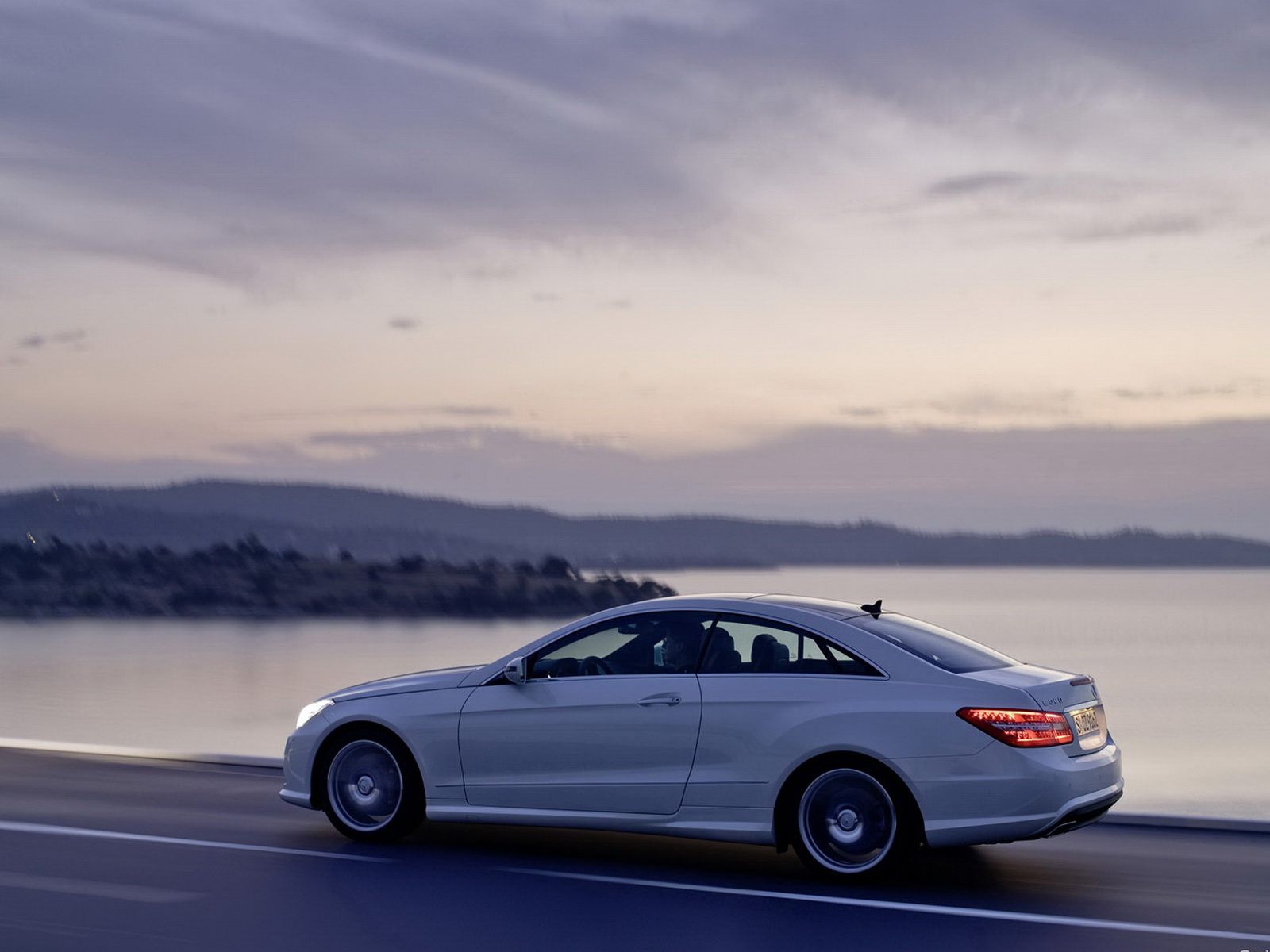 Скачать обои для рабочего стола Mercedes E coupe вид с камеры сбоку и фото