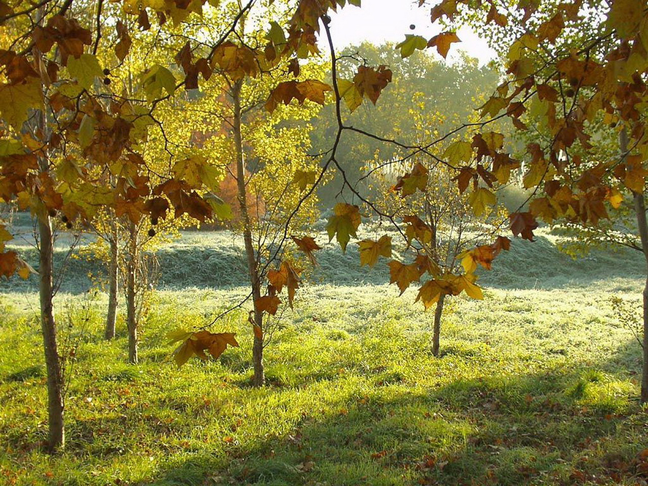 Скачать обои для рабочего стола Молодые деревья в осенней роще и фото