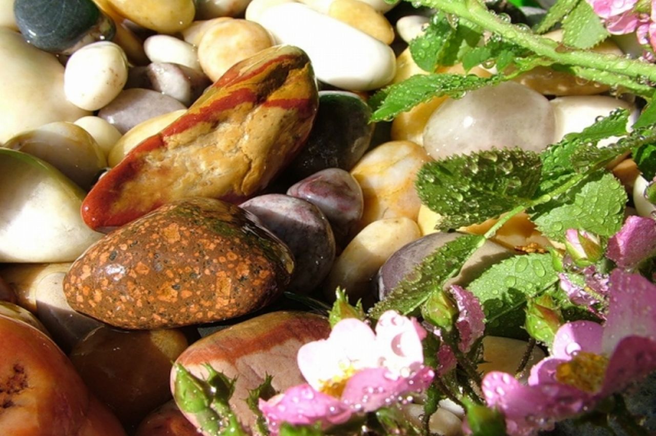 Скачать обои для рабочего стола Морские камни и цветки шиповника и фото