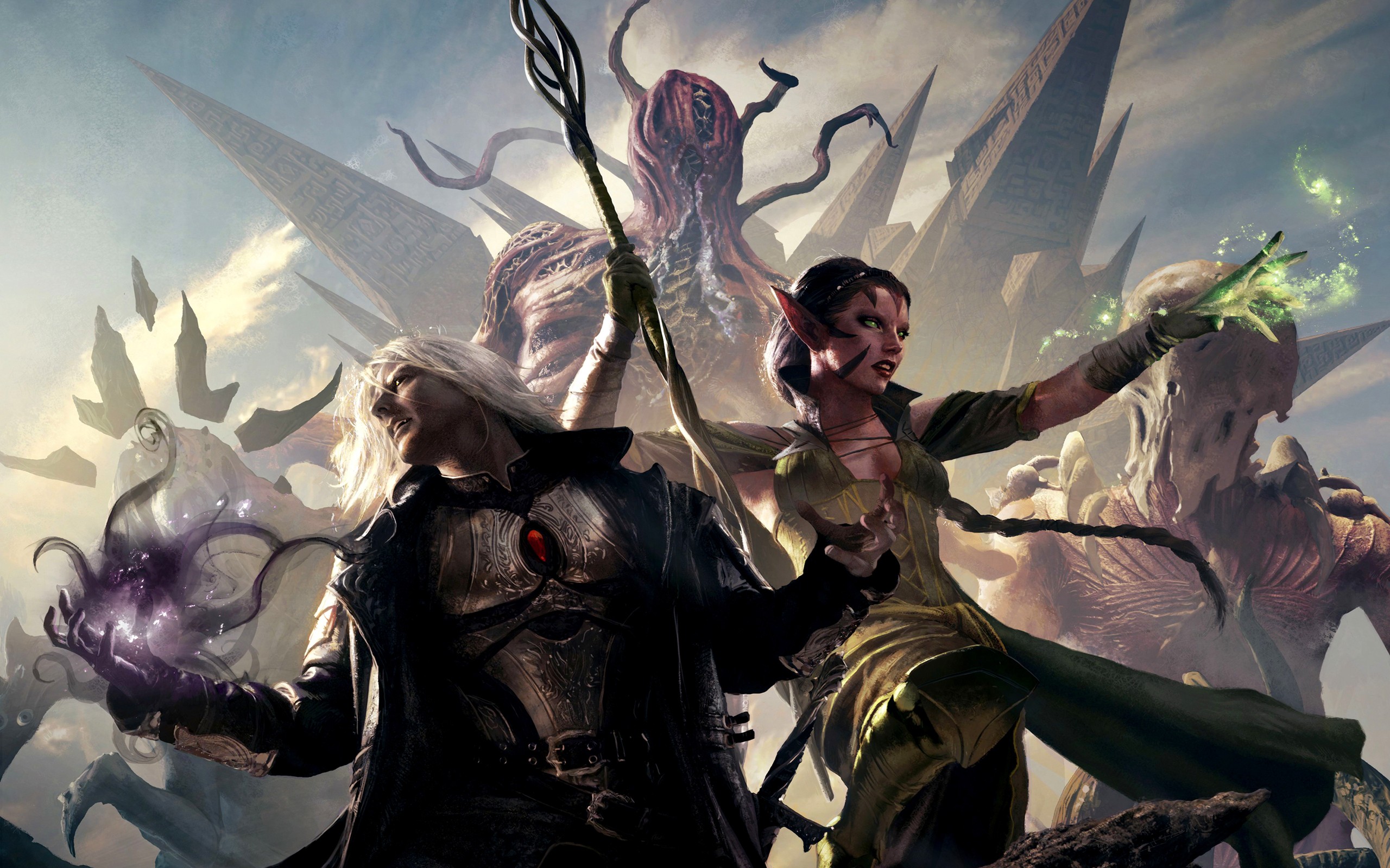 Скачать обои для рабочего стола Мужчина с эльфийкой и монстры и фото