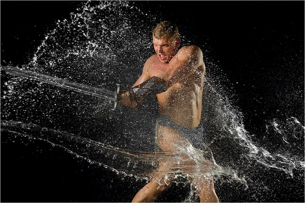 Скачать обои для рабочего стола Мужчина с мечом в брызгах воды и фото